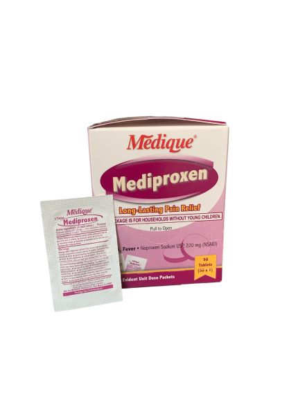 Mediproxen 100 ct. Compares to Aleve® Long-lasting relief from pain associated with headaches, muscular aches and minor arthritis. Effectively reduces fevers from colds and flu. Each tablet contains: Naproxen Sodium 220mg 100 Tablets in Tamper Evident packets
